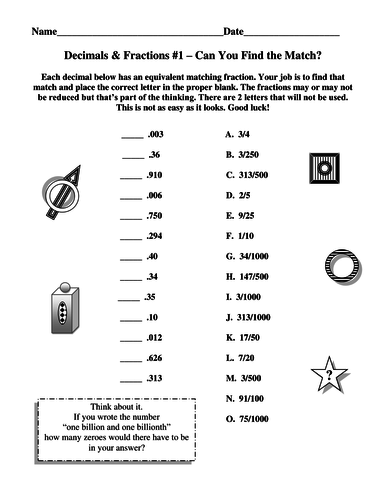 Decimals And Fractions Matches 1 And 2 Teaching Resources