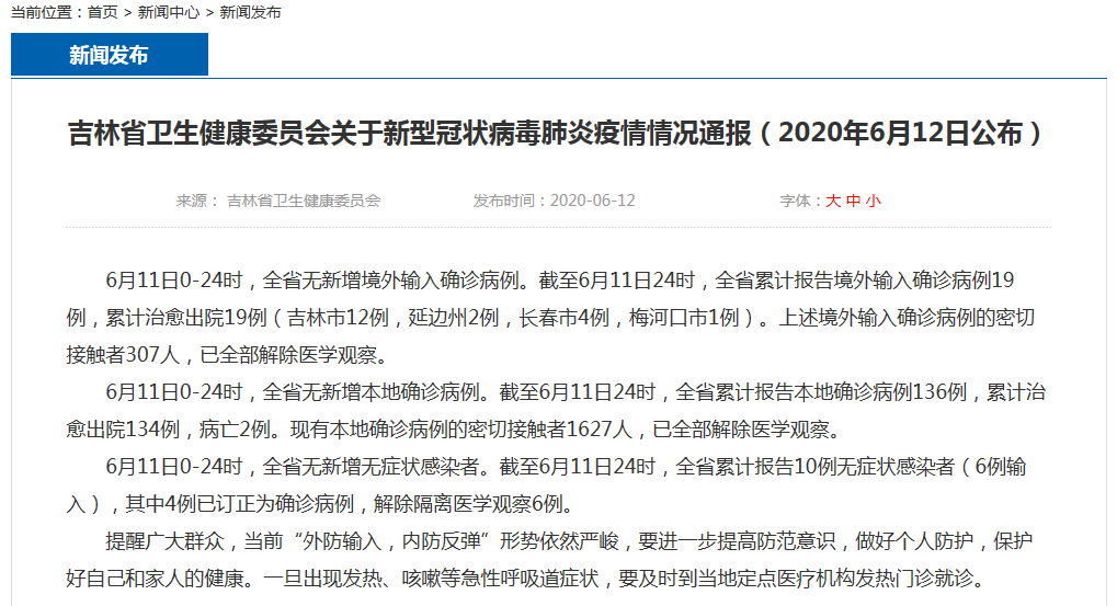 吉林省卫生健康委员会关于新型冠状病毒肺炎疫情情况通报 年6月12日公布 中国吉林网